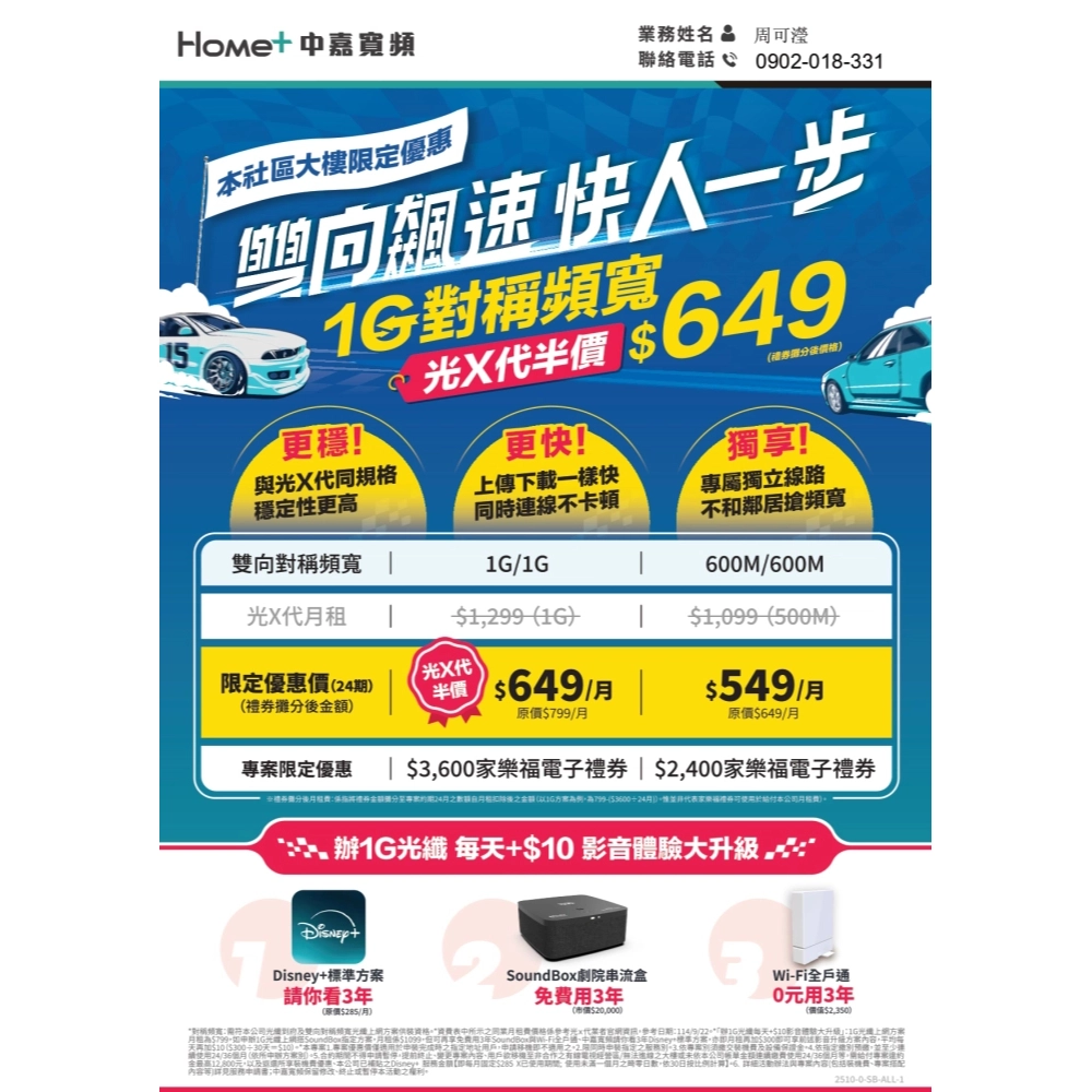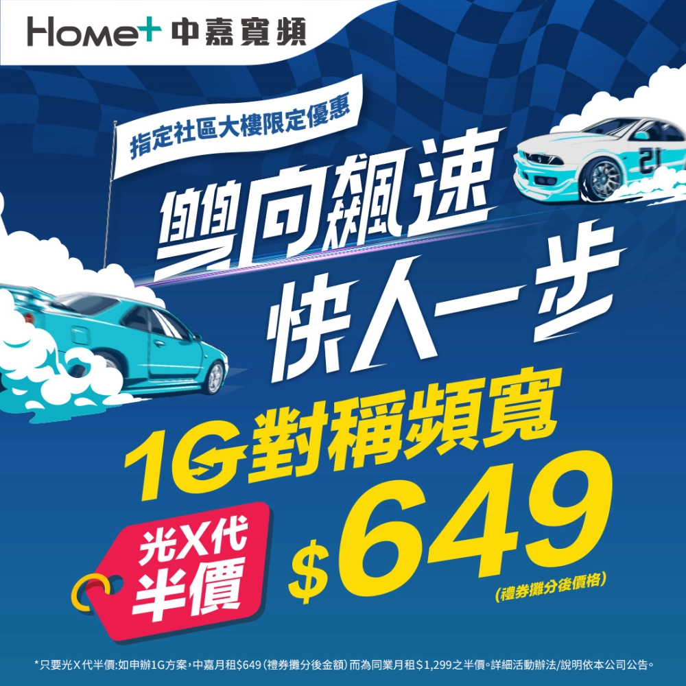 中嘉寬頻持續推動「光 X 代」專案,針對指定社區住戶,推出 1G/1G 對稱光纖半價優惠。凡符合資格者,月付僅需 $649(折抵後價),即可享受頂級網速。